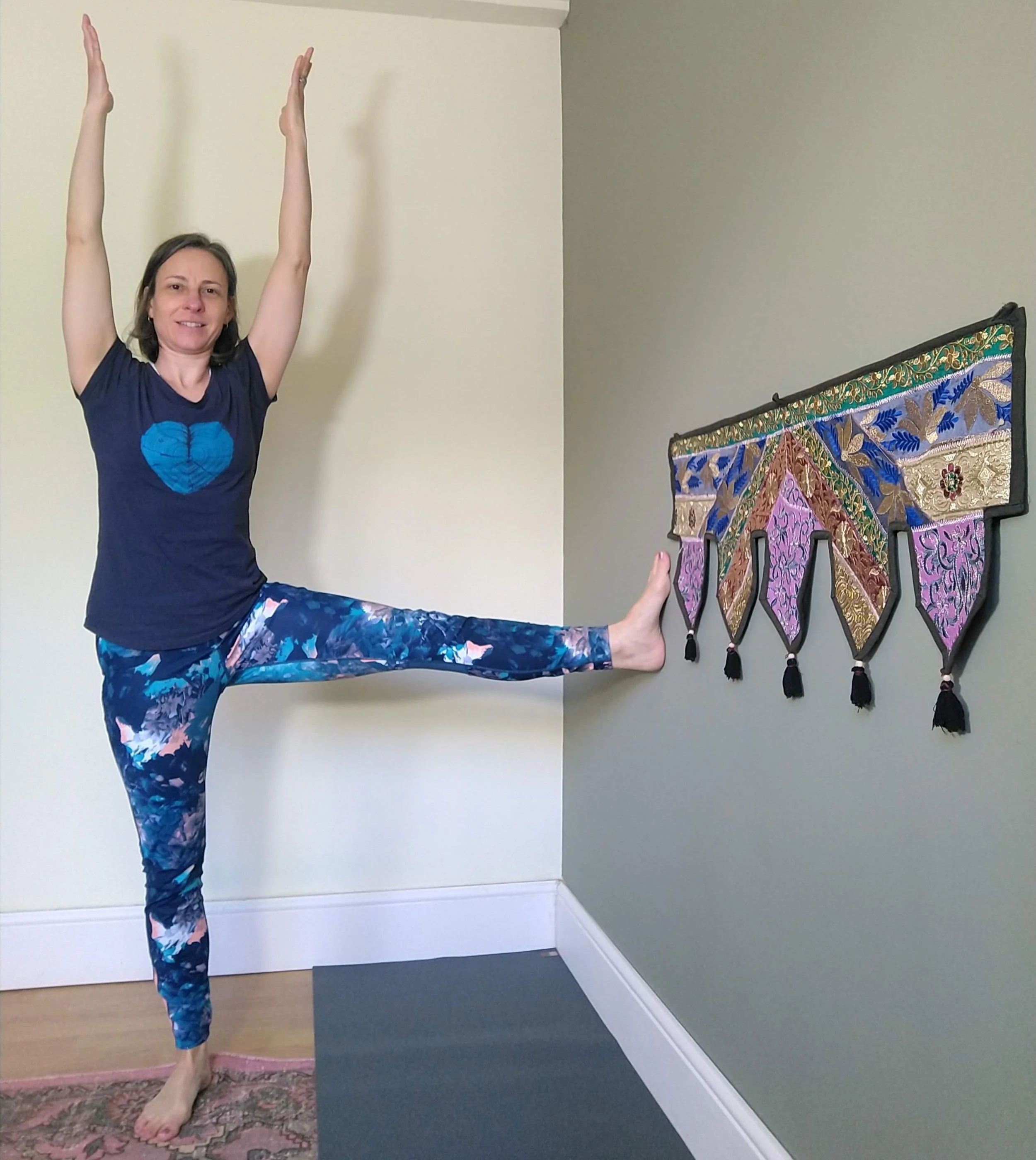In this wall variation we are not holding the foot with the hand. Instead you put your foot on the wall to hold you in the balance. This leaves your arms free to take over your head, or you could bring them to prayer position at your heart. Bending the standing leg a little can help.