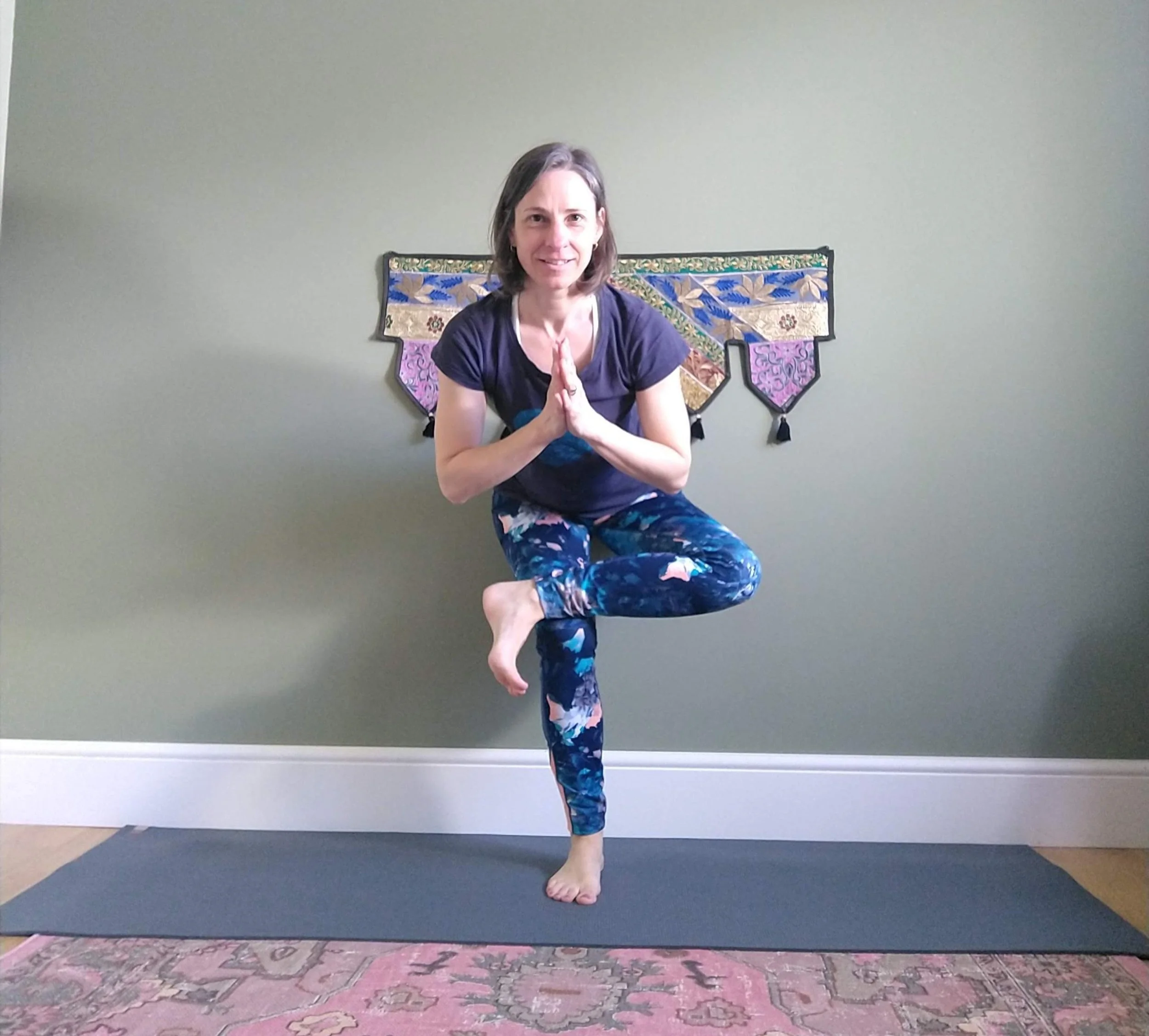 This can be a useful way to find your balance in tree pose. Rather than hold the wall with your hand (which is another variation) you can balance with your knee resting on the wall. This leaves your hands free to bring to prayer position at your heart, or take your arms overhead.